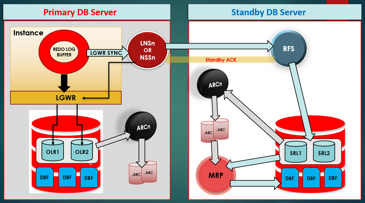 What is Standby Redo Log or SRLs? Why do we need Standby Redo Logs ? Standby redo logs or SRLs are used only when the database is running in the standby role. Standby Redo logs (SRLs) are not required if the database role is Primary, but these can be created in Primary database since these are required after switchover operation when Primary database becomes standby database. Standby redo logs can be created during standby configuration or after the standby creation. Standby Redo Logs are required to avoid data loss in case of Primary DB server outages like failover situation. From 10g onwards both Physical and Logical standby databases support Standby Redo Logs. Please note that every entry written into the Online Redo Logs of the Primary Database is transferred to the Standby Site and written into the Standby Redo Logs at the same time which reduces Data Loss in case of Primary outages. With Real-Time Apply, Redo is applied to the Standby Database from the Standby Redo Logs instead of waiting until an Archive Log is created and hence SRLs are required for Real-Time Apply. From 10g, Real-Time Apply is possible with both Physical and Logical Standby Databases. Configuring standby redo logs on primary will automatically create standby redo logs on standby if you configure DR using RMAN duplicate method "duplicate target database for standby from active database". Standby Redo Logs will only benefit if you set LGWR as the Transport Process on the Primary Database in the LOG_ARCHIVE_DEST_n destination Parameter. Below are the redo transport processes for SYNC and ASYNC mode. 1) NSS - Network Server SYNC Process 2) NSA - Network Server ASYNC Process 3) TT - Redo Transport Slave Process In 10.2 and 11.1, LNS process was used in both SYNC and ASYNC mode. From 11.2 onwards, NSS process is used for SYNC mode and TT process for ASYNC mode, except NSA process is used for ASYNC mode in 11.2 .